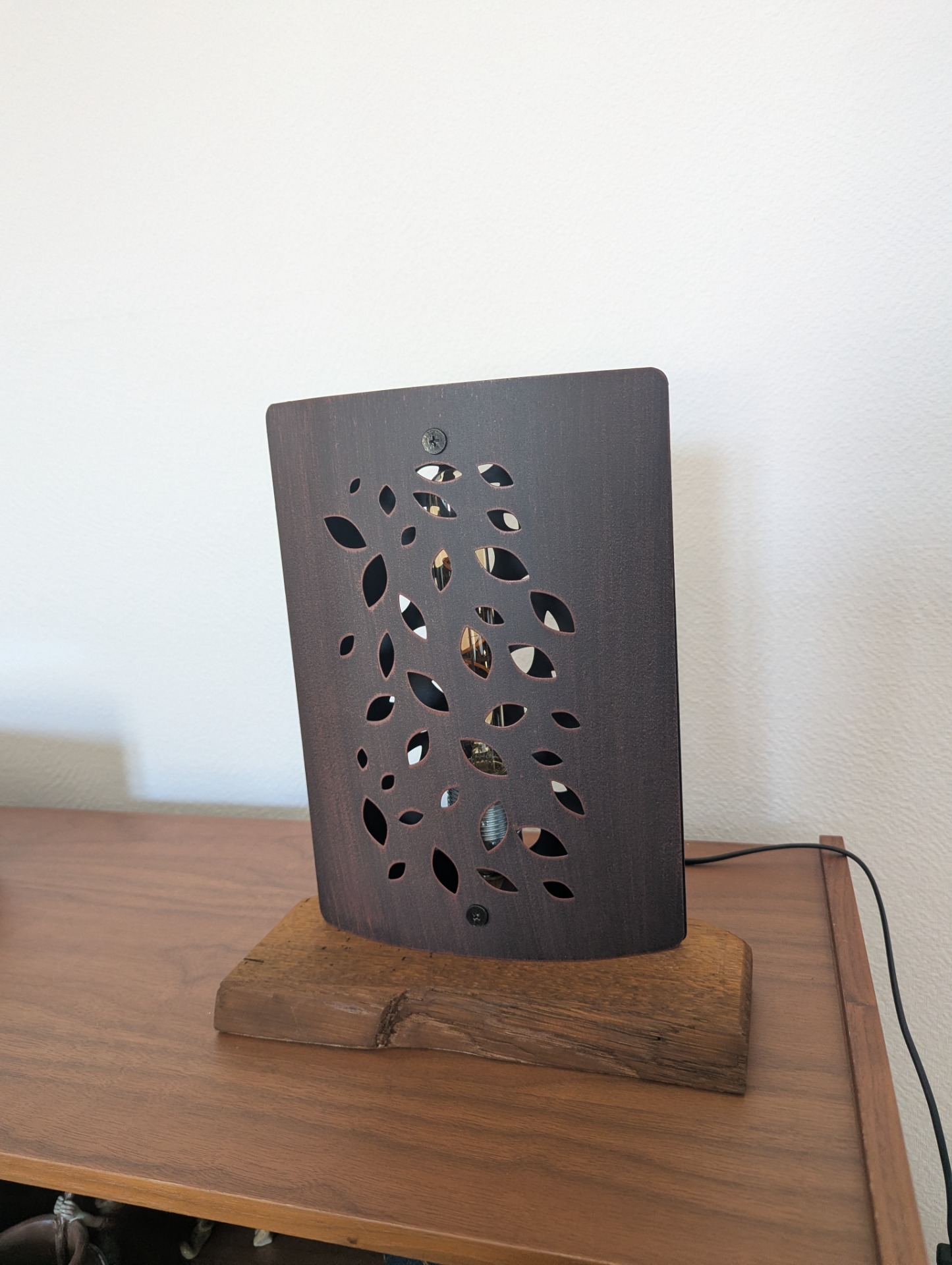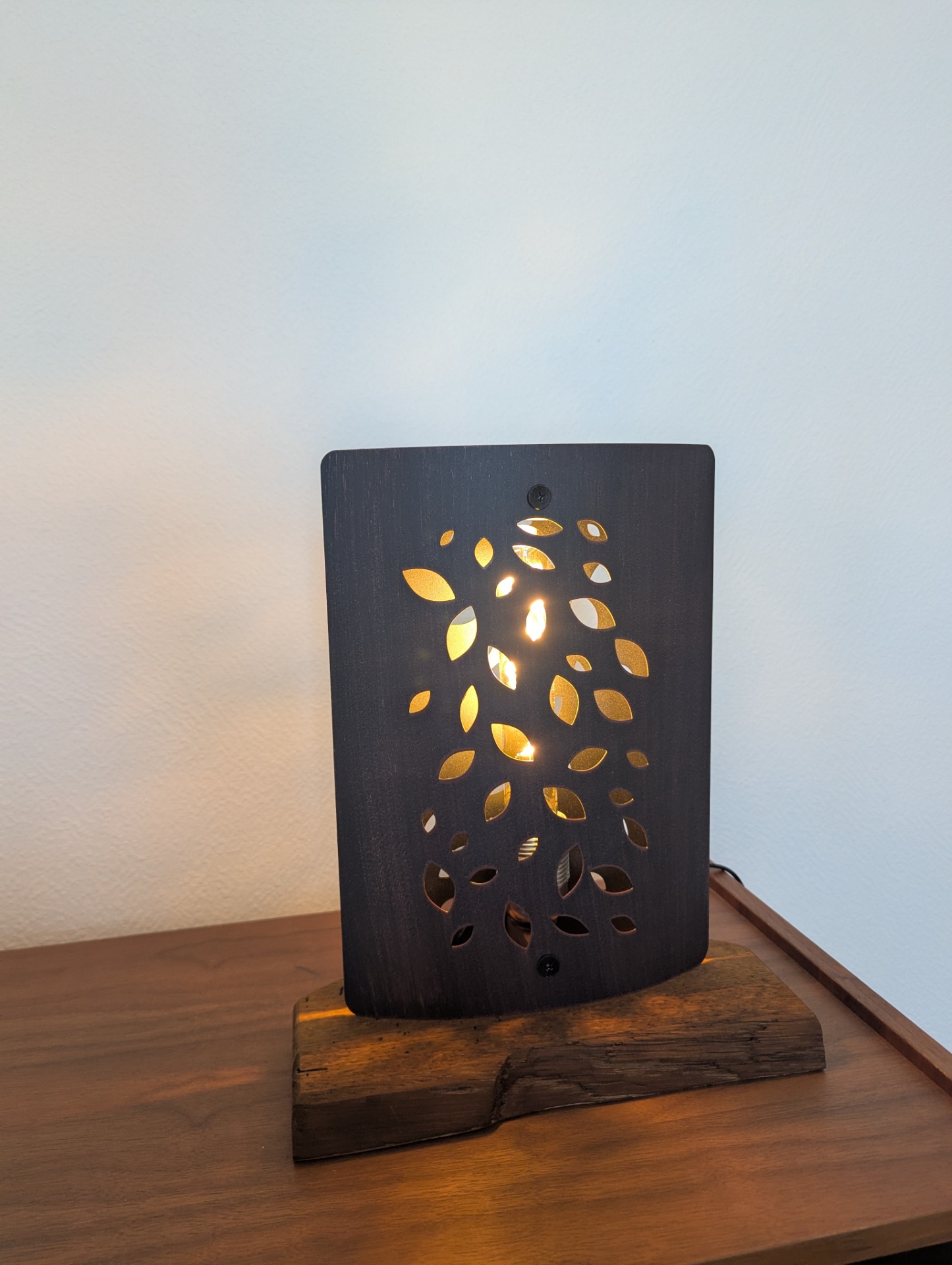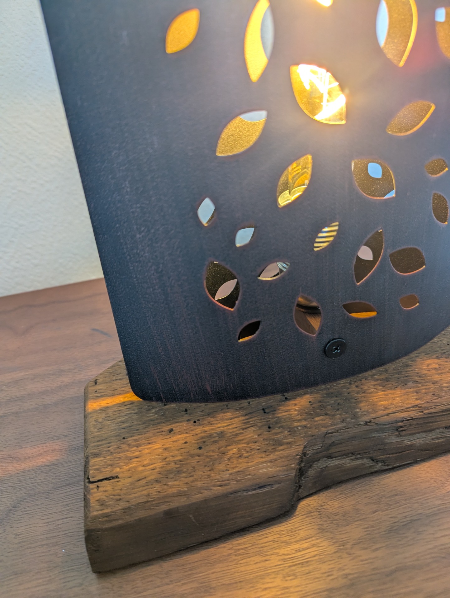 Deux plaques de métal ciselées, courbées, en bon état, dont on ne saura jamais à quoi elles étaient destinées et un socle en bois de chêne issu d'une vieille étagère, le tout électrifié.