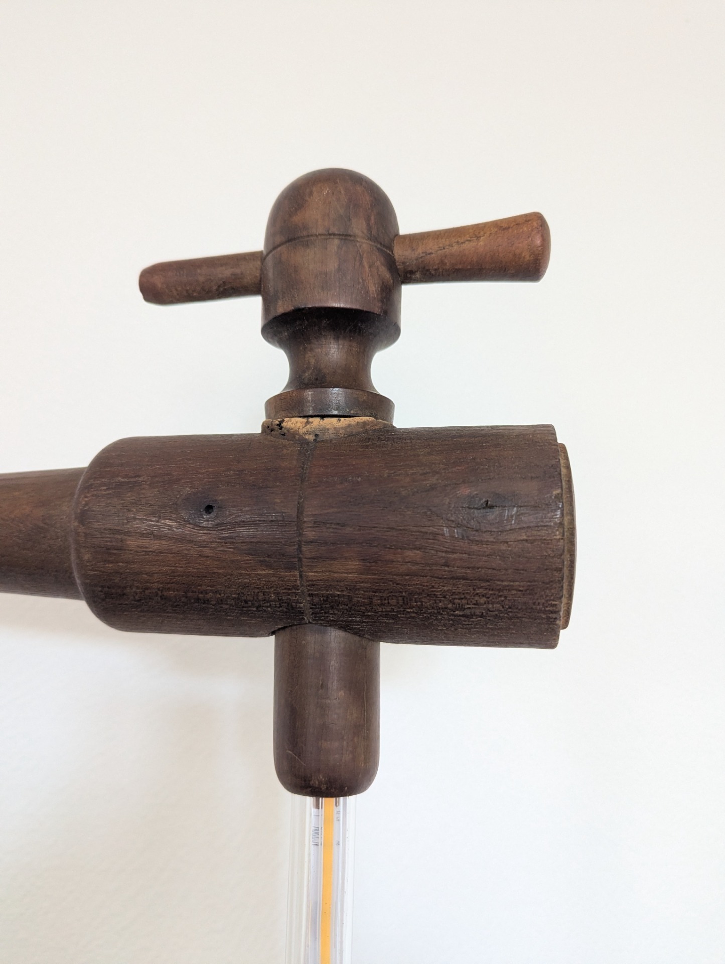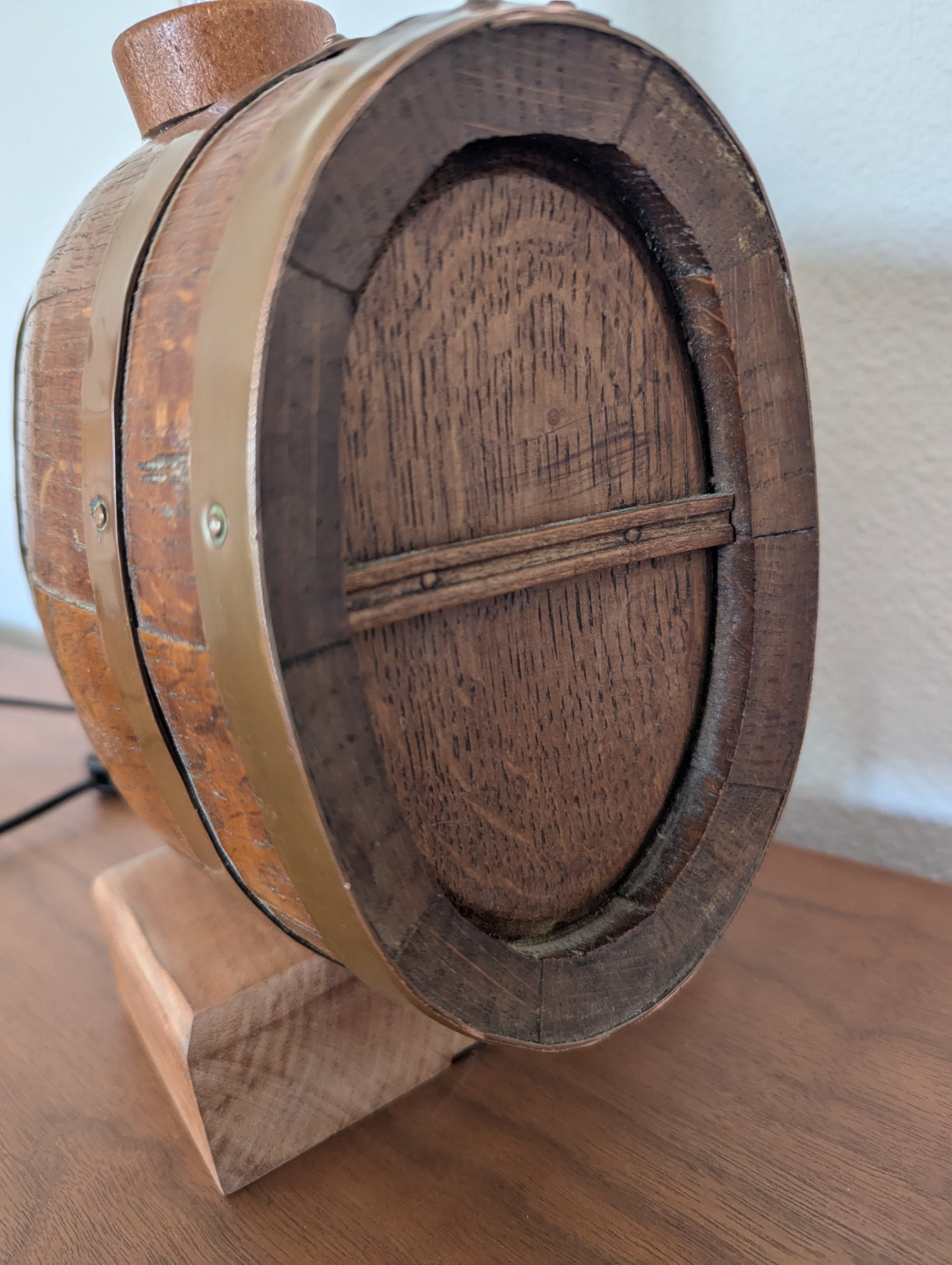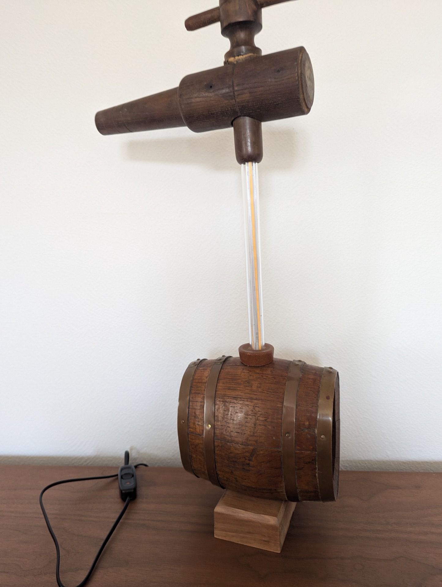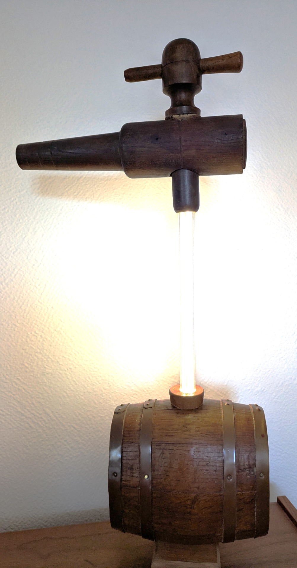 Un petit tonneau en bois acheté sur un vide-greniers, une cannelle récupérée dans une brocante normande, un peu de réparation, un peu de rénovation du bois, un tube acrylique enfermant une bande Leds, un pied fait de bois Moabi et c'est une autre histoire.